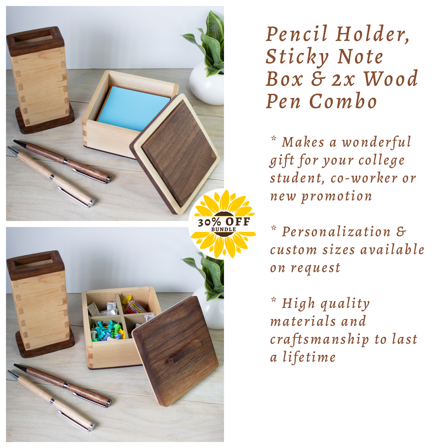 Desktop storage box handcrafted from hardwood. Includes a removable divider, molded with renewable PLA, that splits the box space into 4 sections. It’s just the right size for holding pads of sticky notes (w/o the divider), paper clips, thumbtacks, snacks, or any other small essentials you need to keep handy.