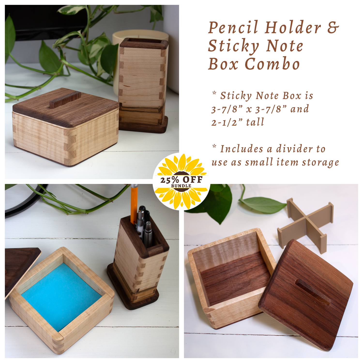 Desktop storage box handcrafted from hardwood. Includes a removable divider, molded with renewable PLA, that splits the box space into 4 sections. It’s just the right size for holding pads of sticky notes (w/o the divider), paper clips, thumbtacks, snacks, or any other small essentials you need to keep handy.