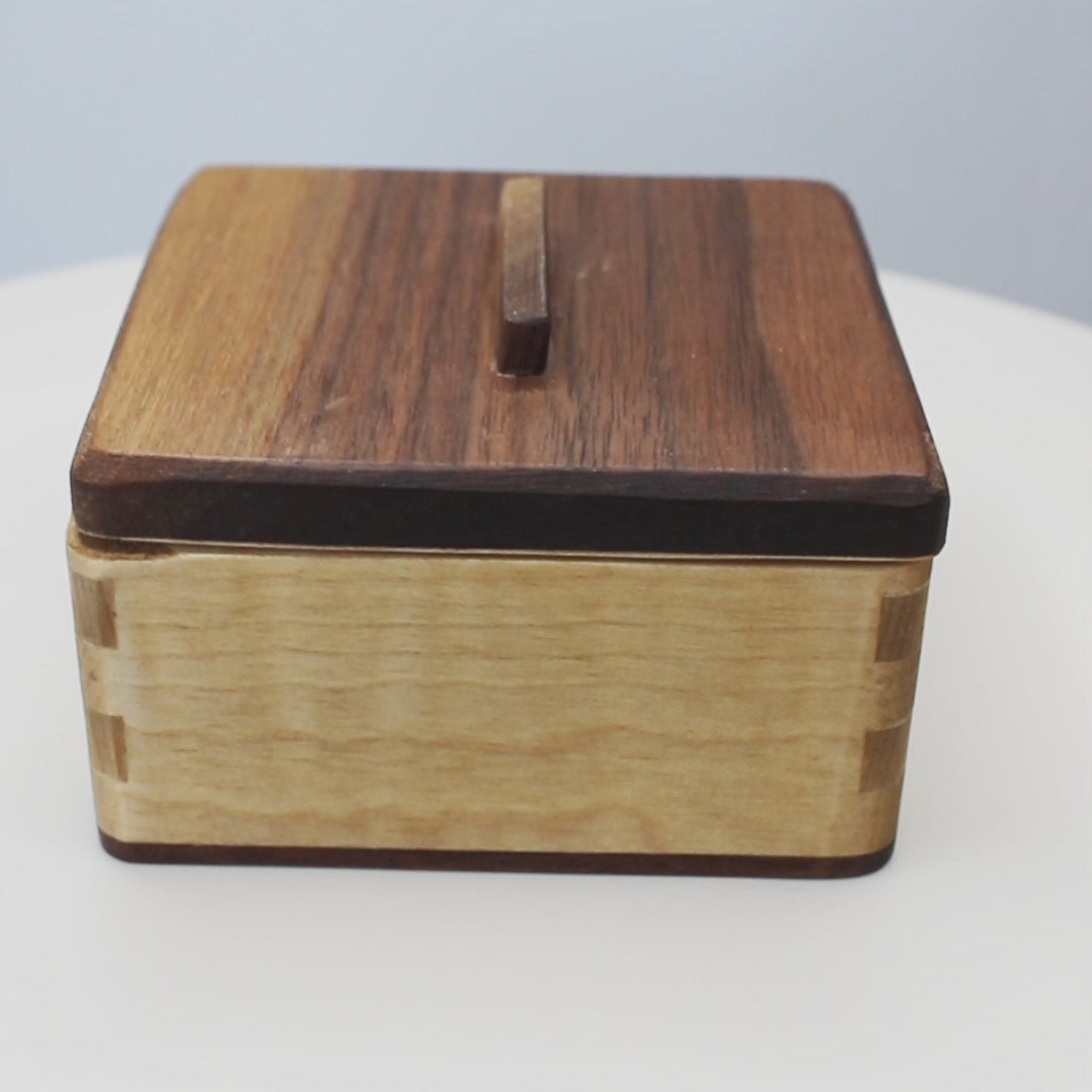 Made from scratch with high quality Maple sides and Black Walnut lid and base. The lid is fitted for a satisfying close but not so tight that it'll get stuck.